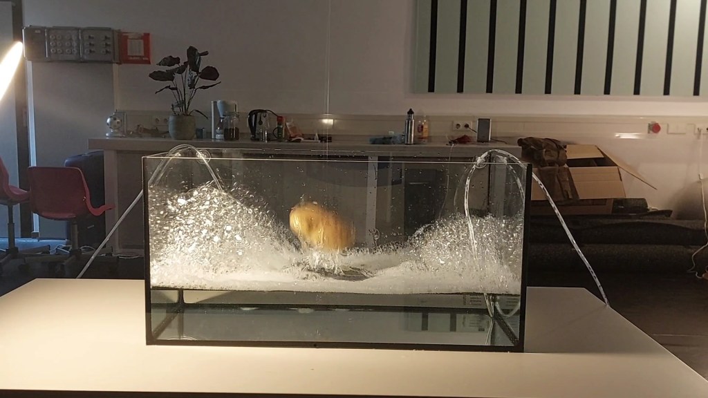 ‘Het ruime sop’ is a performance created by Suzan Stouthart, Nicole van den Berg and Isaac Poels. From sound design to scenery and video works, everything within the performance was handpicked and crafted. This included many hours of filming in uncomfortable positions, daytrips to GAMMA, experiencing different motions of potatoes, recording desert sounds from non-desert items and learning how to use a jigsaw fluently. The gallery is an accumulation of bits and pieces from the process. We will continue to develop the performance further and show it in our new studio space in Tilburg.