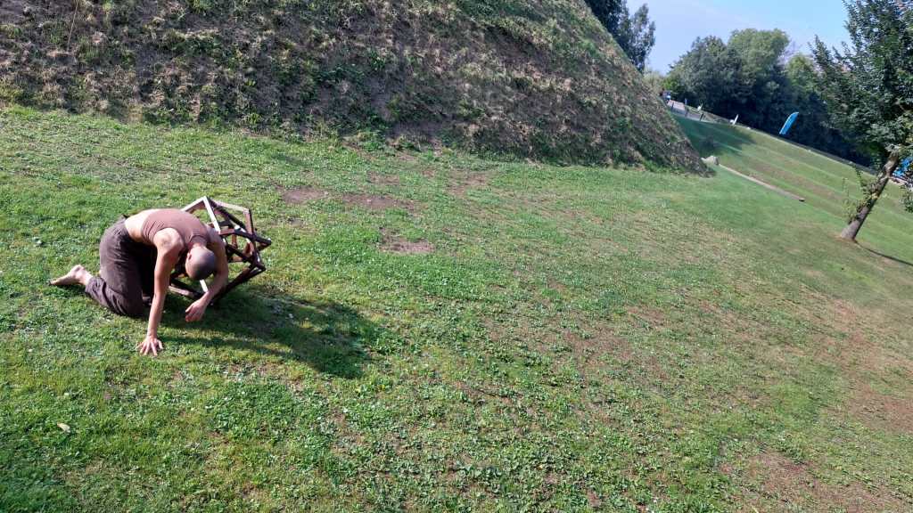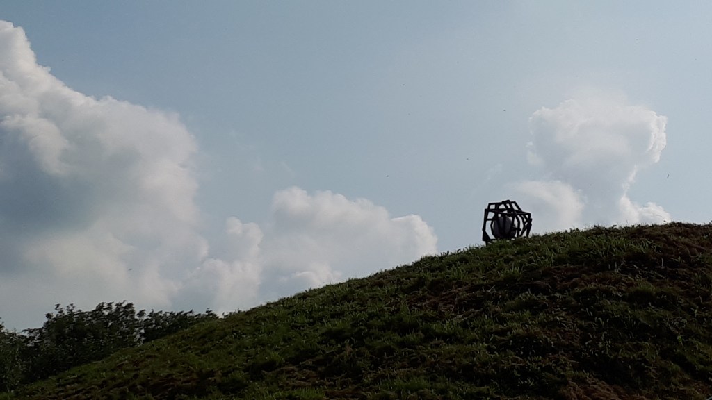 The WEBO came to life during a two-week residency at ‘Werk aan het Spoel’ in Culemborg. The site is part of the Nieuwe Hollandse Waterlinie, an important defense work within Dutch history. The use of height differences within the landscape was the starting point of this work, resulting in a performance that allows physical labour, sound, object and landscape to relate to eachother by means of kinetic energy.